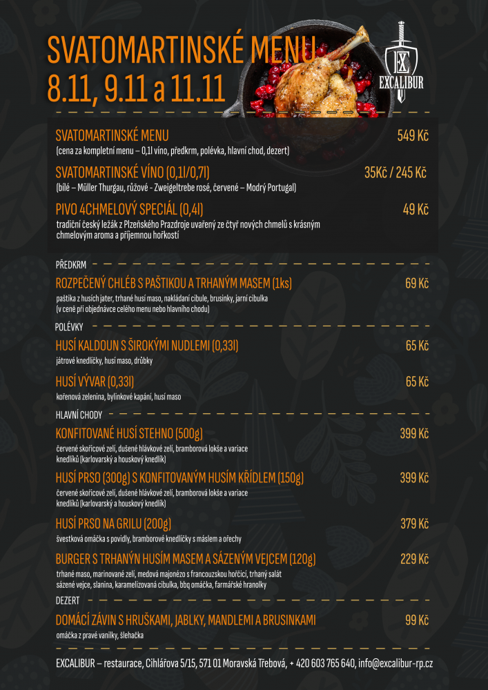 Již zítra nás čeká magické datum 11.11. spojené se svátkem svatého Martina a jak jsme avizovali, tak zítra bude Excalibur pro Vás otevřen po celý den s nabídkou svatomartinského menu, které bylo již o víkendu v naší nabídce. Hus a porcí bylo požehnaně a i na zítra dopékáme další várku porcí z husího menu. Takže přátelé, kdo jste o víkendu nestihl dorazit a dát si porci husy, tak zítra ještě máte možnost.